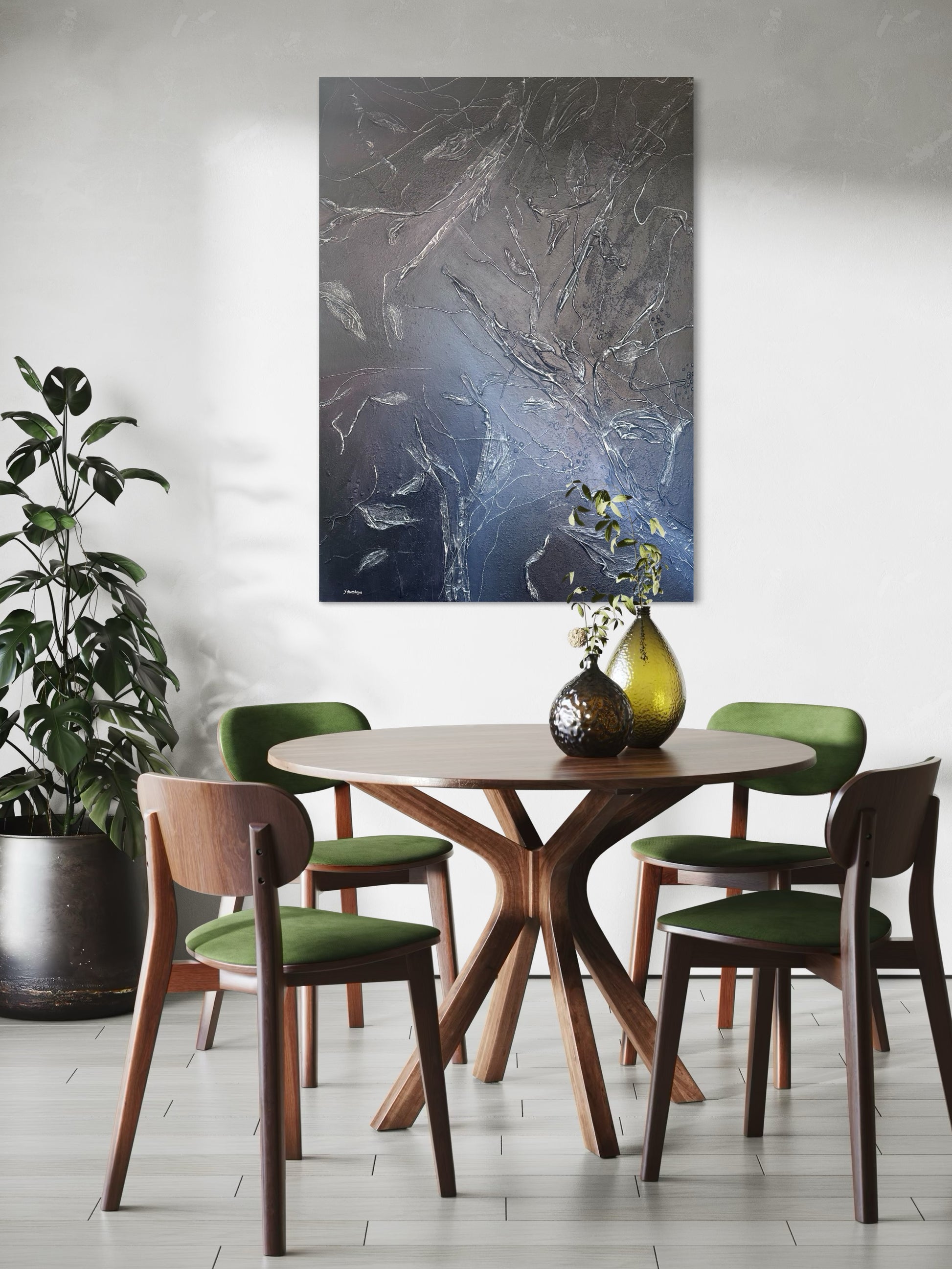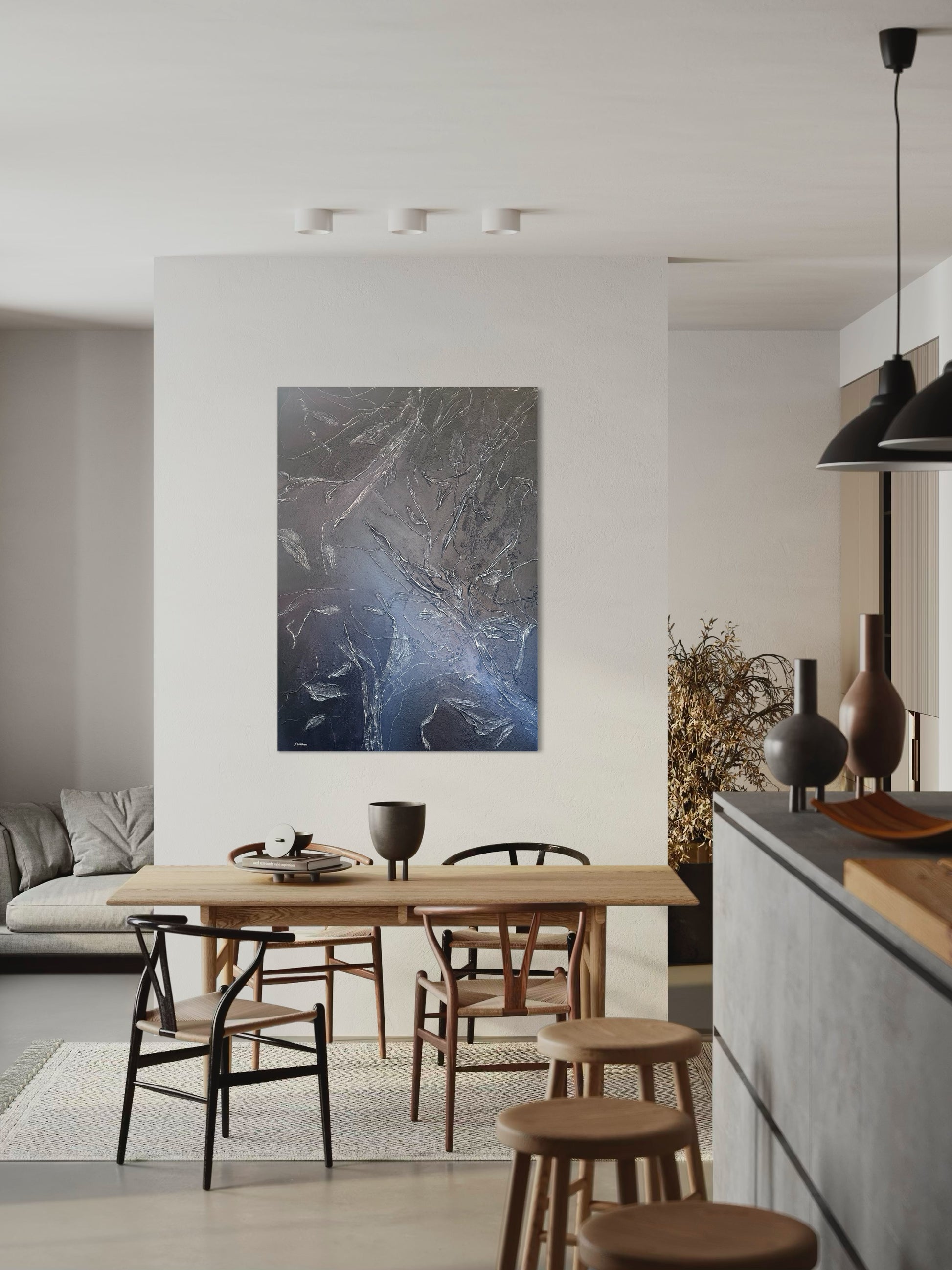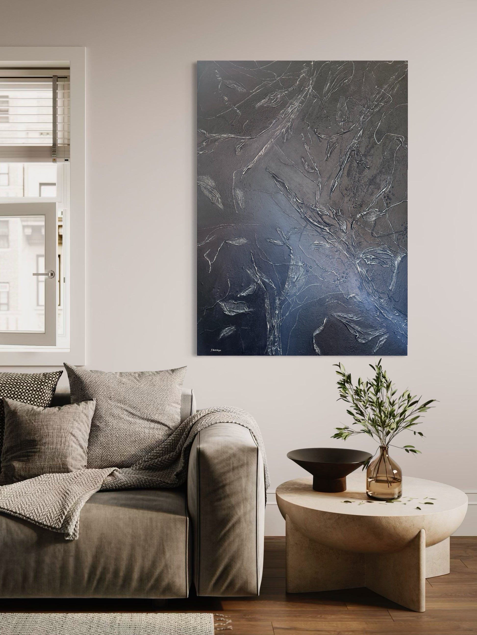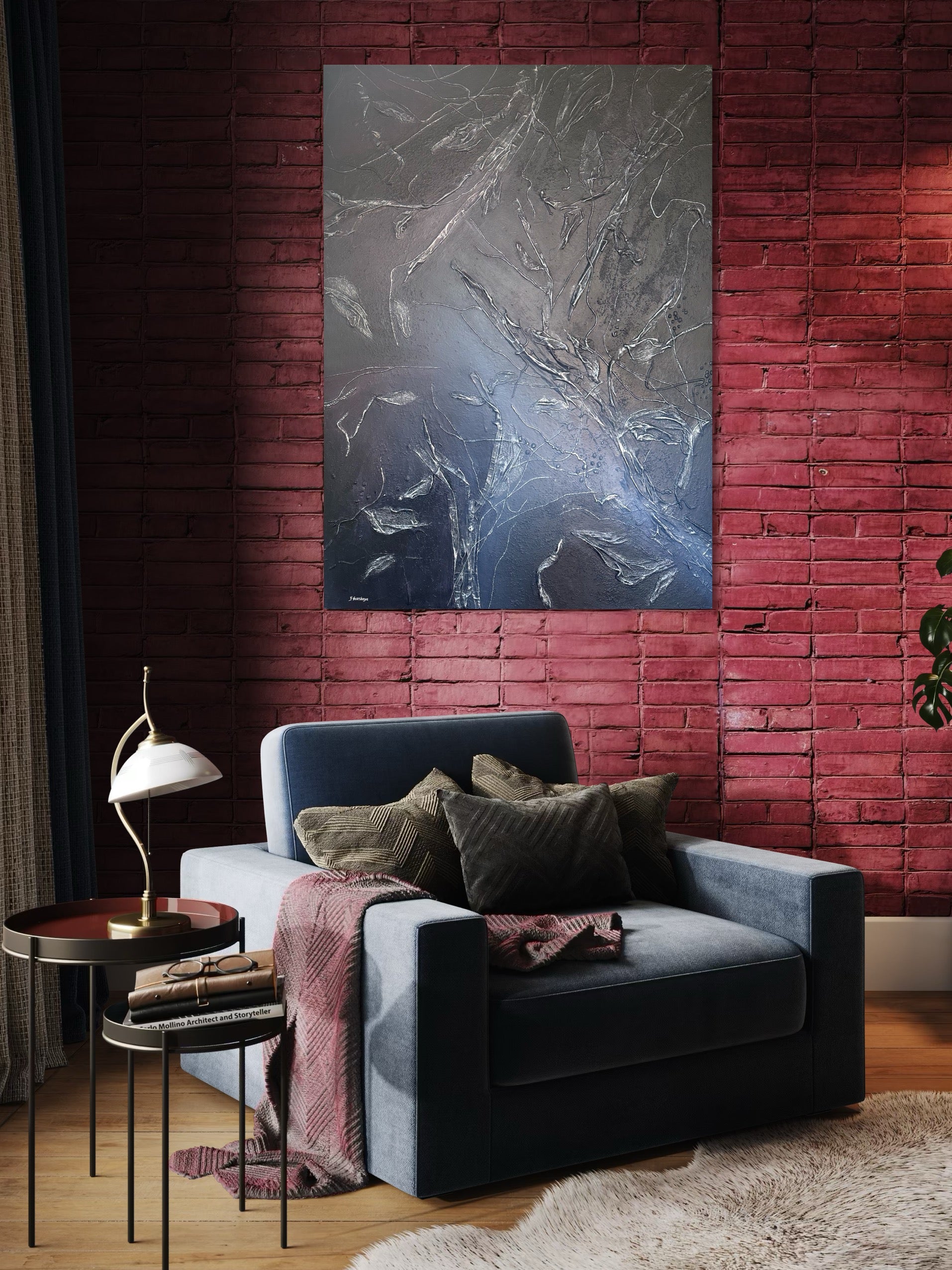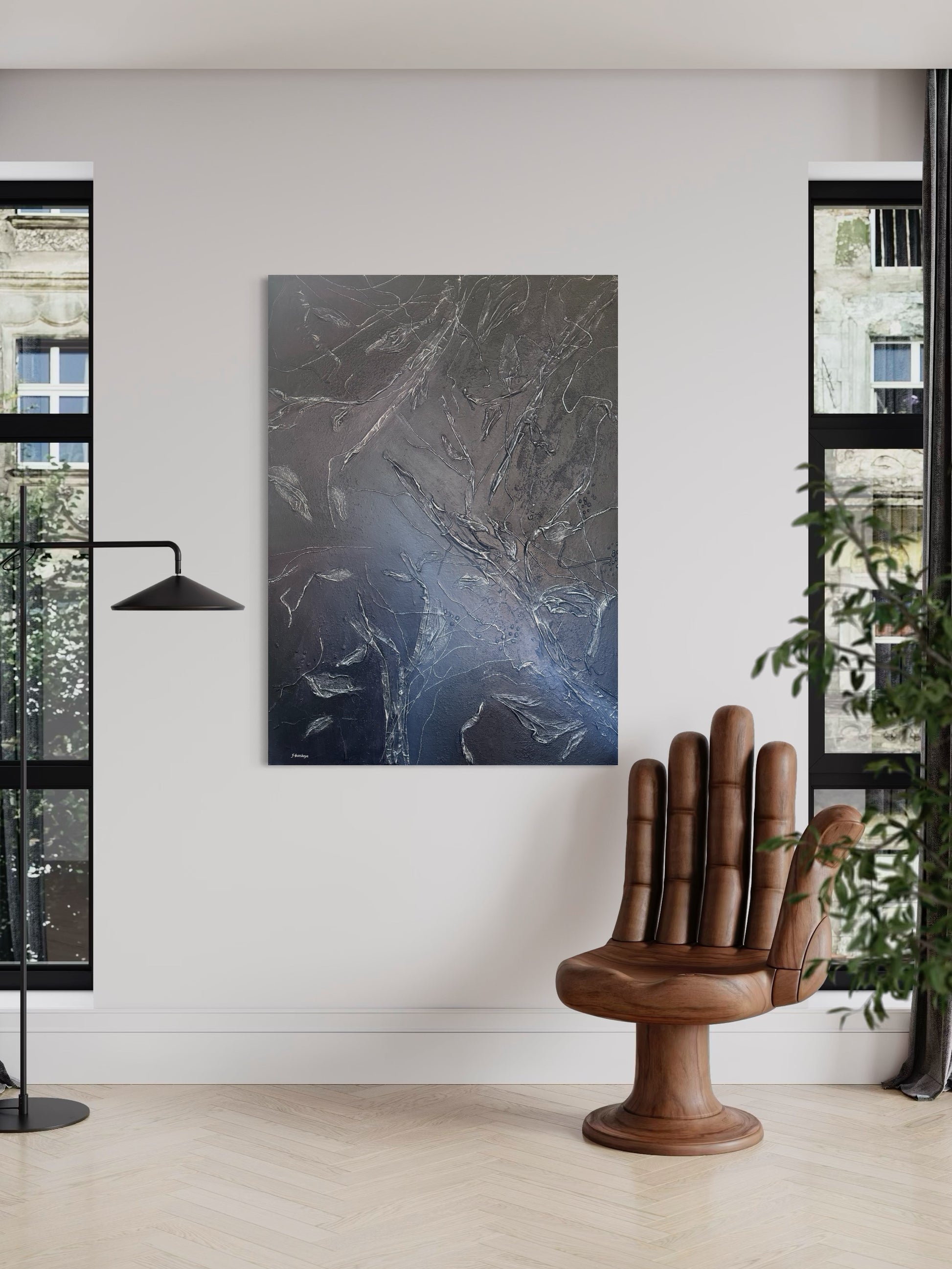 • Leinwand, Acryl, Textilien, Quarzsand, Schutzlack.