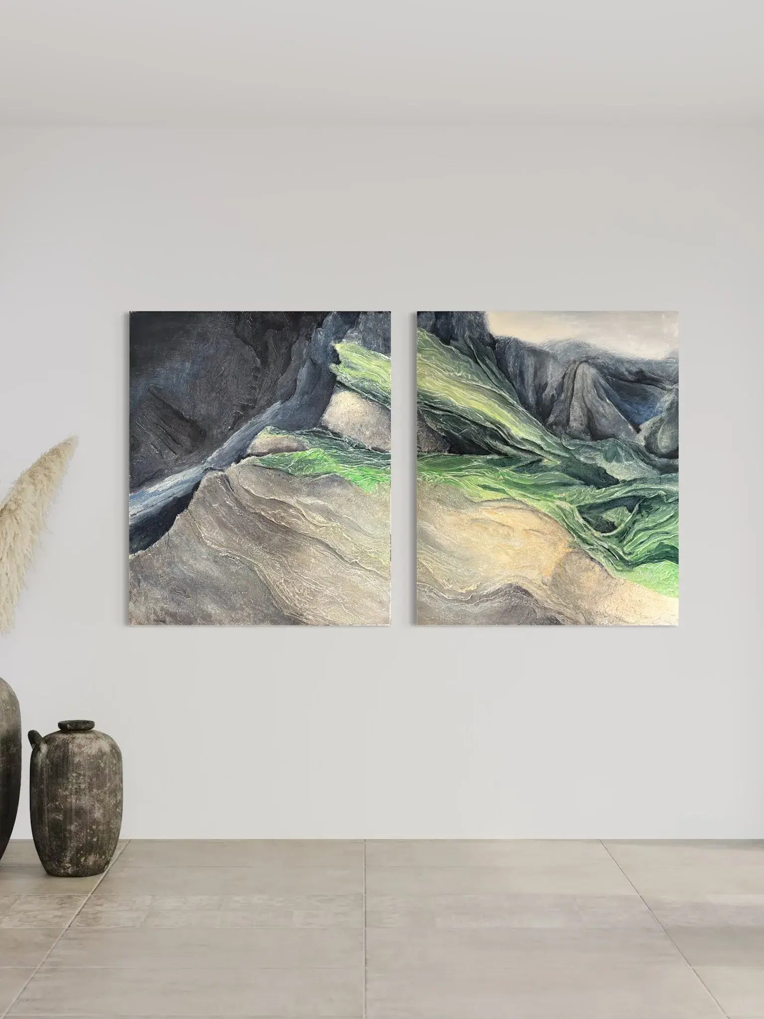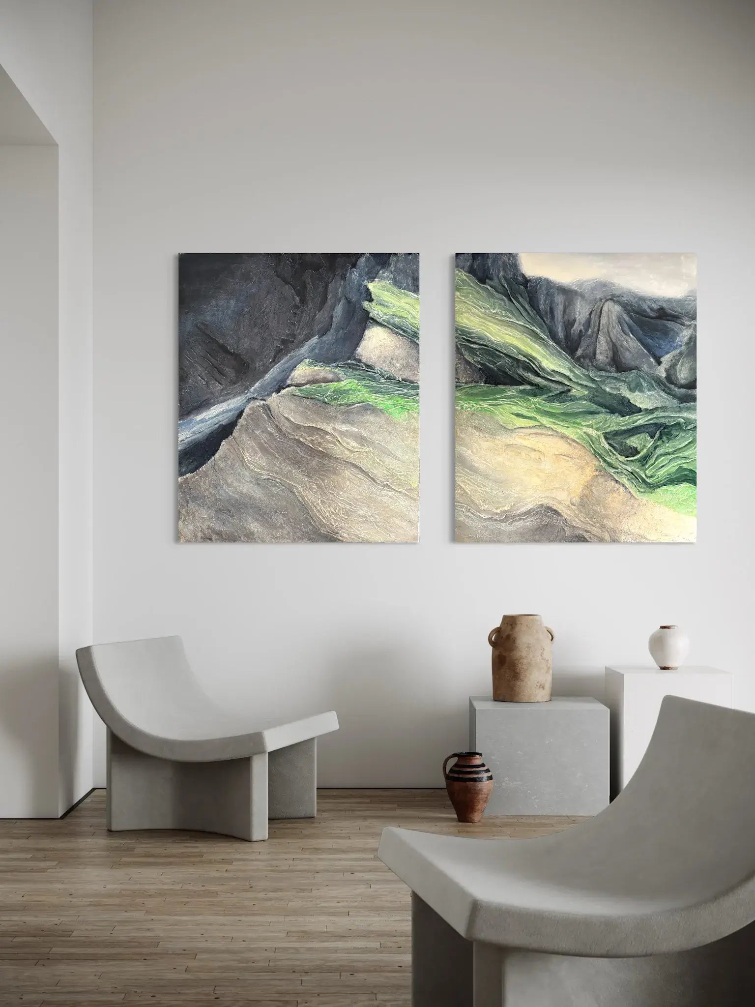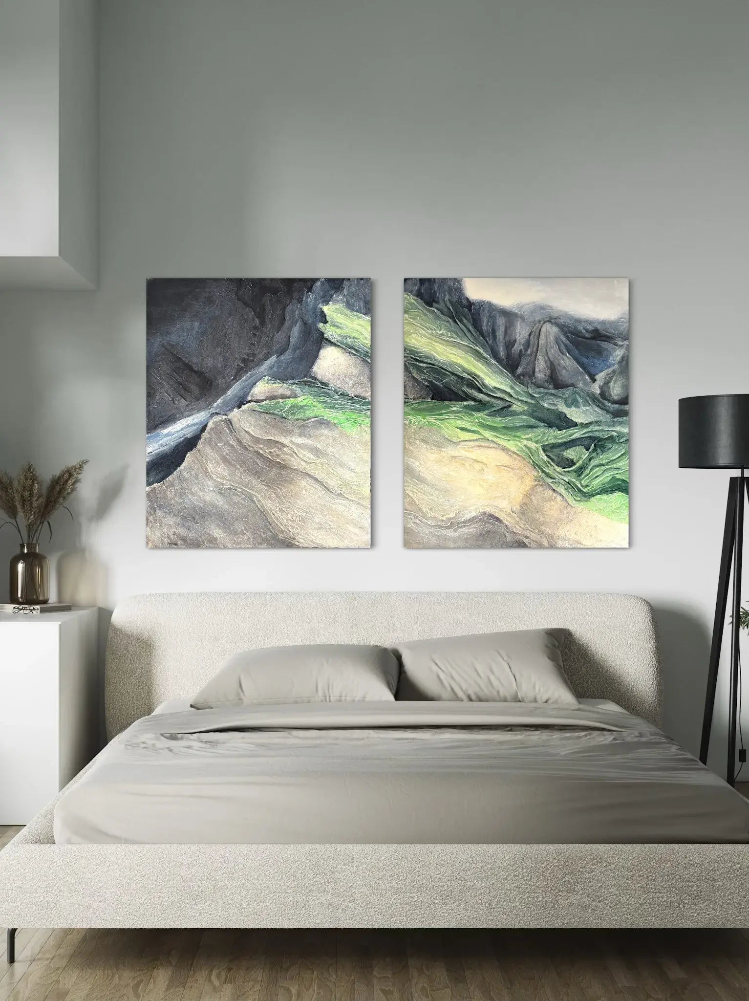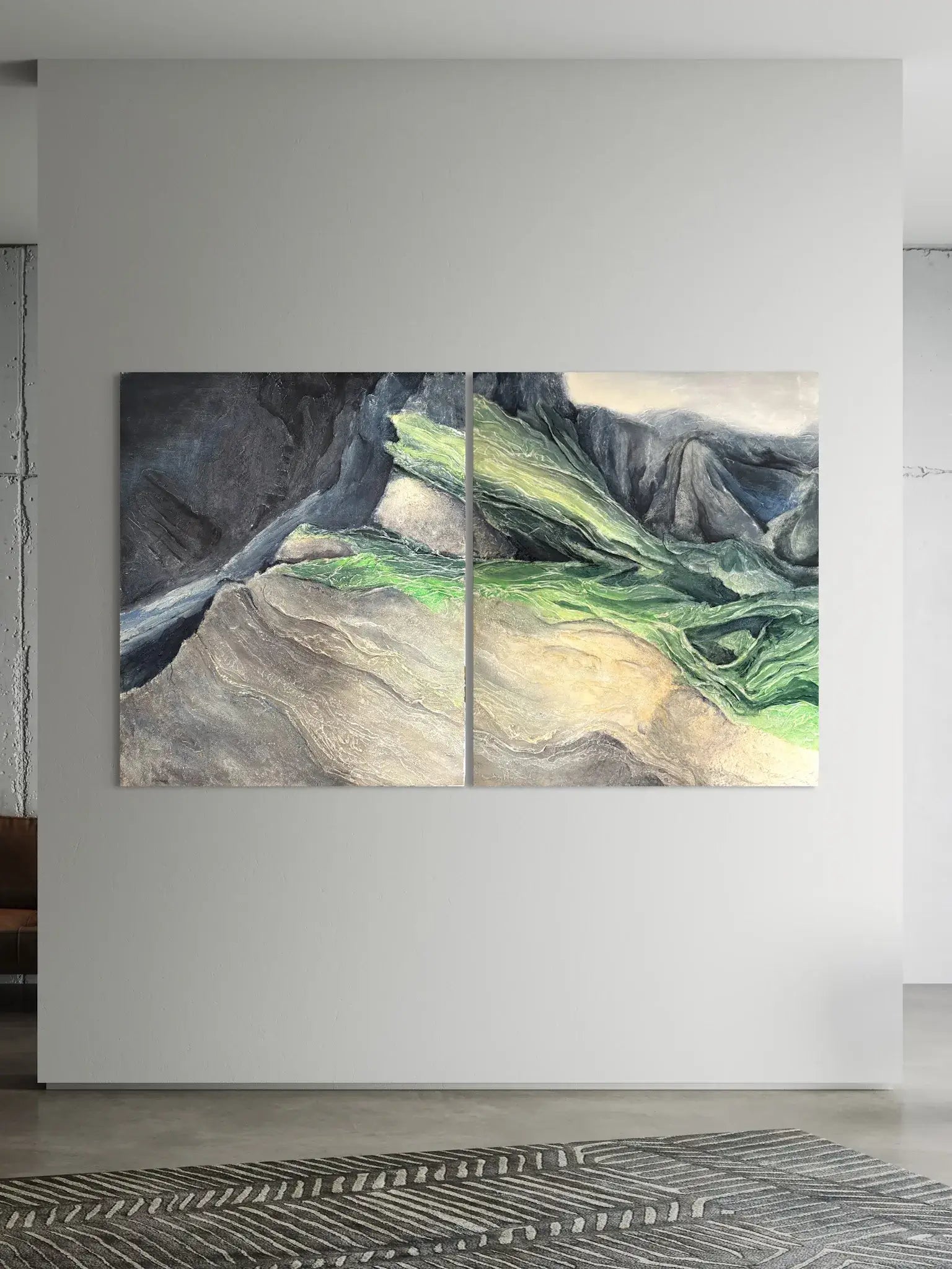 • 2-teilige Arbeit. Abmessungen jedes Teils: 100 (B) x 120 (H) cm.